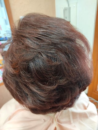 前日にベルジュバンスの酸性パーマをかけていただき、その後にHQヘナを塗布をしてそのままお帰り頂き、翌日ご来店いただいた時の写真です