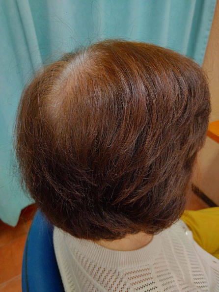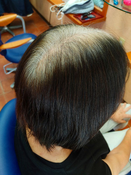 下の写真は、前回ケミカルヘナ(ジアミン染料入りヘナ)で染めていたお客様で、1ヶ月前に初めてマニキュアで白髪染めをしていただいたお客様の写真です