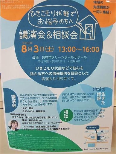 その他 · 2019/08/01 お知らせ 今日のブログは、告知です。 このブログを観た方で、ご自宅や知り合いの方に『ひきこもり状態』で悩んでいる方がいらっしゃいましたら、近隣で、こんな講演会があります。 tagPlaceholderカテゴリ: