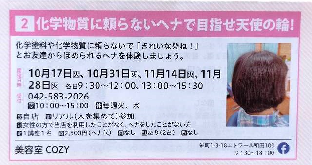 10月16日日曜日から11月30日木曜日まで「第11回 日野まちゼミ」に参加いたします。 今回もヘナを体験いただくイベントを、COZYで開催することにいたしました。 ヘナに興味はあるけれど一度試してみたい!と思っている方には、是非この機会をご利用ください。