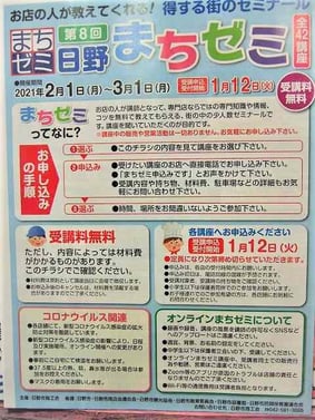 第8回日野まちゼミが、来月の2月1日月曜日から開催の予定だったのですが、緊急事態宣言が行われましたので開催が8日月曜日からに変更になりました 開催が一週間遅れますので開催期間も2月8日月曜日~3月8日月曜日と変更になりました